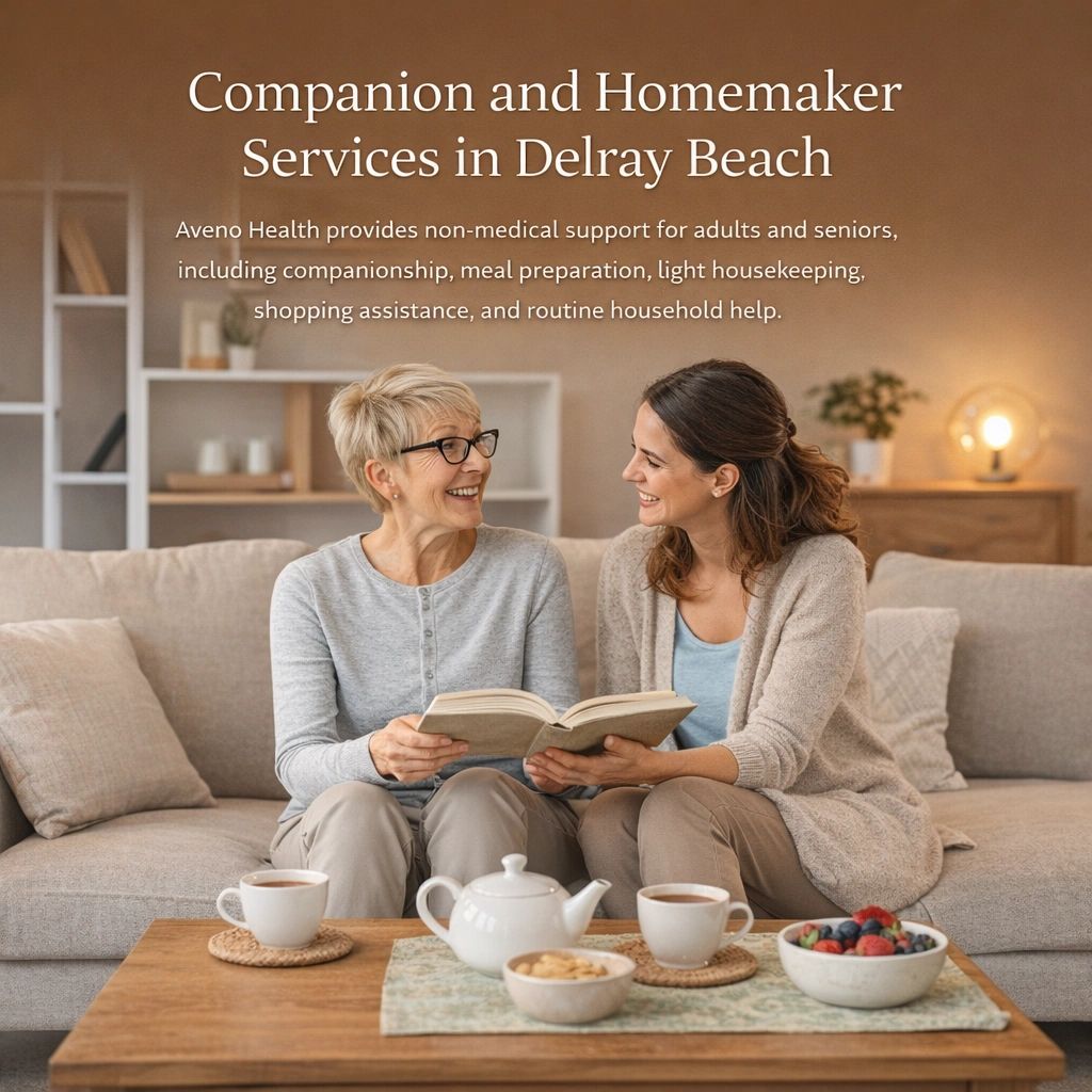 At Aveno Health – Home Care Services of Delray Beach, our mission is to provide reliable, non-medical companion and homemaker services to adults and seniors in our community. We focus on companionship, meal preparation, light housekeeping, shopping assistance, and routine household support that helps clients remain comfortable at home.